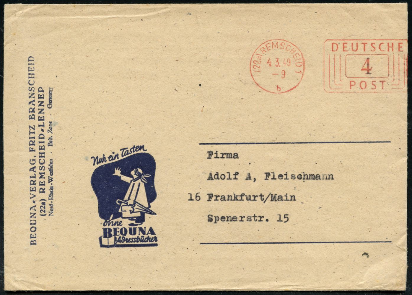 10351 | 16 € | 5630 REMSCHEID : (22a) REMSCHEID 1/ 1/ DEUTSCHE/ POST 1949 (4.3.) PFS Querrechteck 4 (Pf.) auf Reklame-Bf.: BEQUNA VERLAG FRITZ BRANSCHEID.. Nur ein Tasten ohne BEQUNA Adressbuch (Mann mit verbundenen Augen, Aktentasche u. Regenschirm) Inl.-Drs.-Bf. (Dü.D-10, Nr.253) | ![]() | |