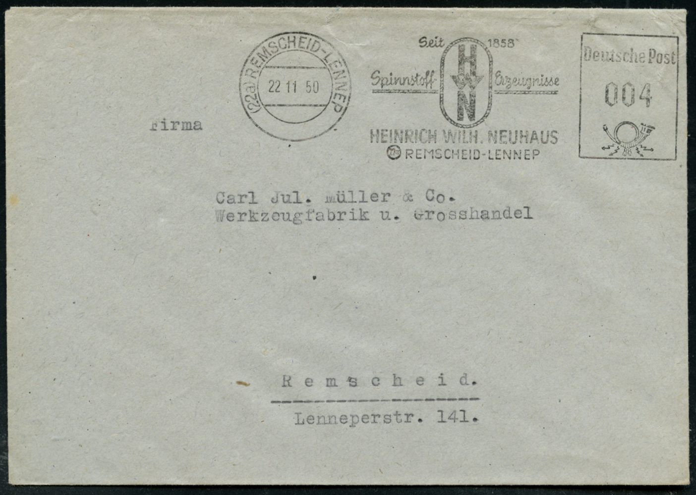 10359 | 18 € | 5630 REMSCHEID : (22a) REMSCHEID-LENNEP/ ..Spinnstoff-Erzeugnisse/ HEINRICH WILH. NEUHAUS.. 1950 (22.11.) s c h w a r z v i o l e t t e r AFS Francotyp "Posthorn" in unzulässiger Farbe! (Monogr.-Logo) Orts-Bf. (Dü.E-20CGo, schwarzviolett = unzulässig!) | ![]() | |