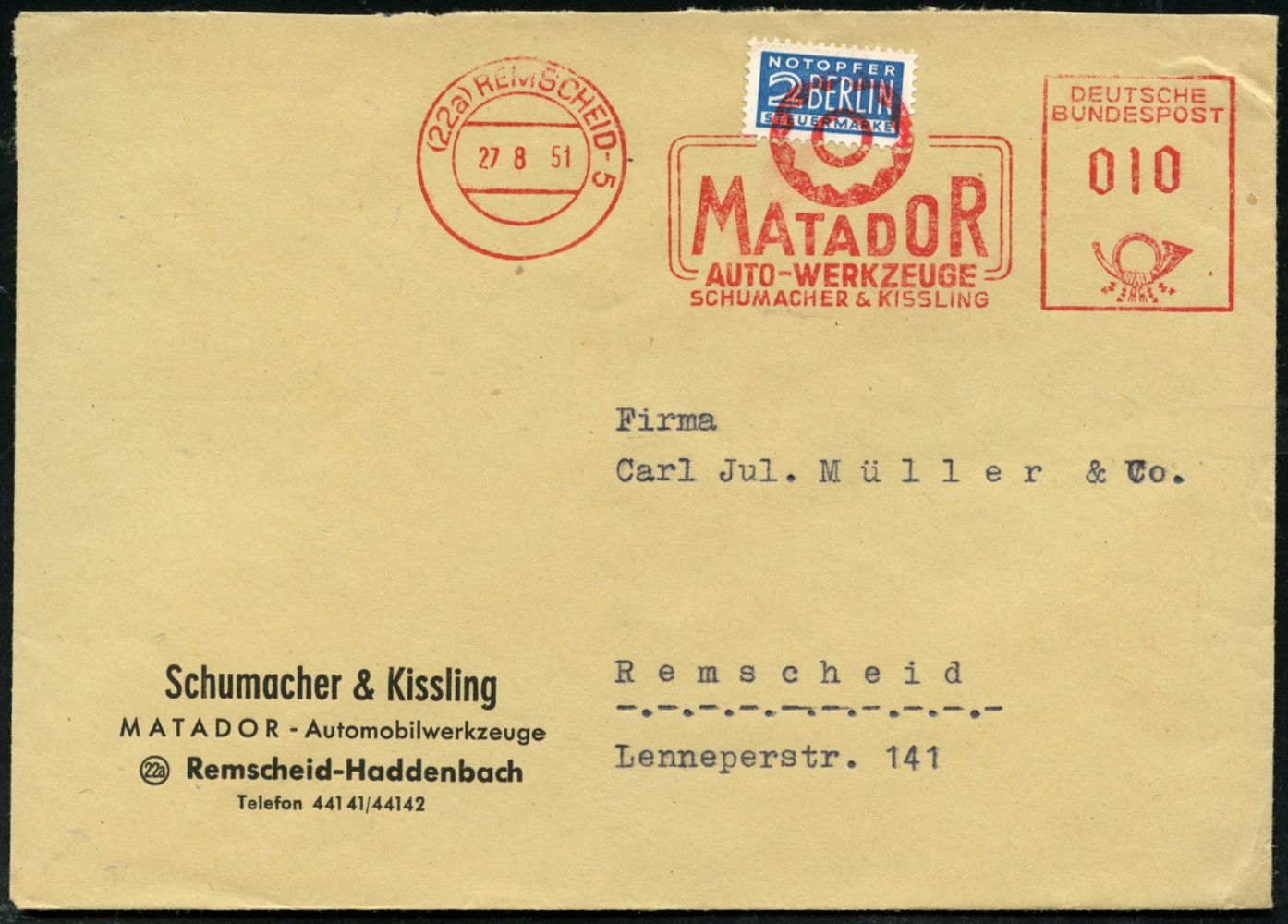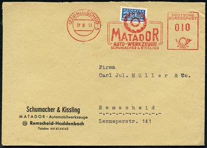 10362 | 16 € | 5630 REMSCHEID : (22a) REMSCHEID 5/ MATADOR/ AUTO-WERKZEUGE/ SCHUMACHER & KISSLING 1951 (27.8.) AFS Francotyp "Posthorn" auf 2 Pf. NoB (= Vorausentwertung) Firmen-Orts-Bf. mit Firmen-Logo (Dü.E-23CGo) | ![]() | |