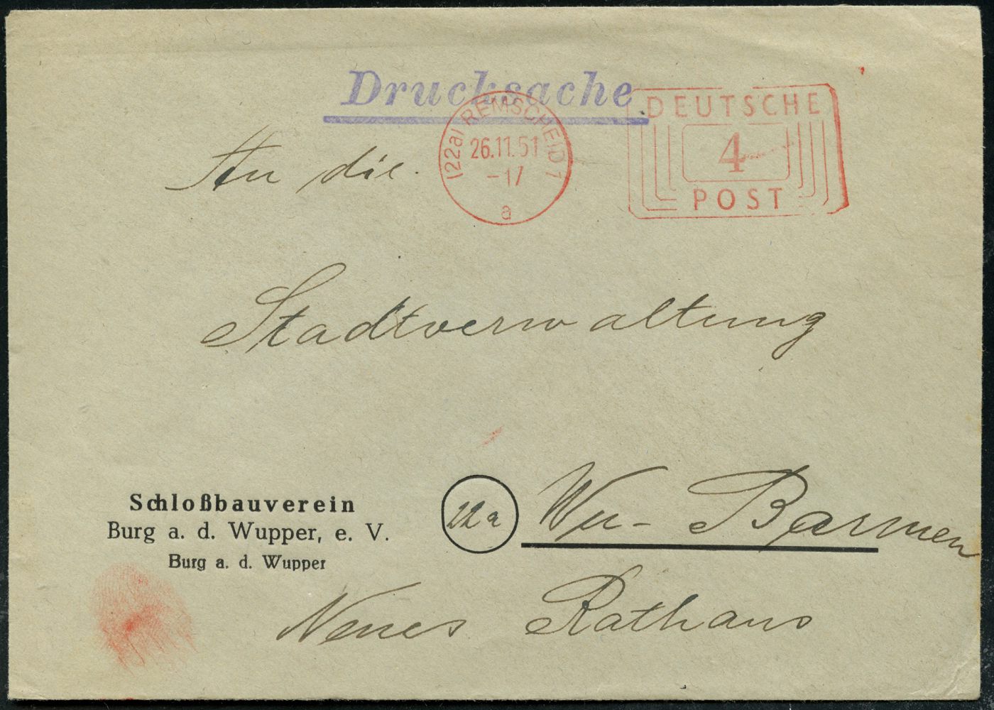 10365 | 14 € | 5630 REMSCHEID : (22a) REMSCHEID 1/ 1/ DEUTSCHE/ POST 1951 (26.11.) PFS Querrechteck 4 (Pf.) auf Vordruck-Bf.: Schloßbauverein Burg an der Wupper e. V. (Dü.D-10, Nr.253) | ![]() | |