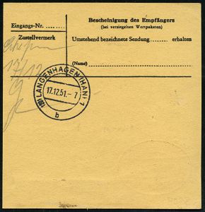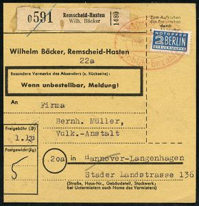 10366 | 18 € | 5630 REMSCHEID : REMSCHEID-HASTEN/ Gebühr bezahlt 1951 (15.12.) Doppel-Oval PFS auf 2 Pf. NoB + schw. Selbstbucher-Paketzettel: Remscheid-Hasten/ Wilh. Bäcker , Inl.-Selbstbucher-Paket-Kt. n. Langenhagen, rs. AS. (Dü.A-5, Nr.20) | ![]() ![]() | |