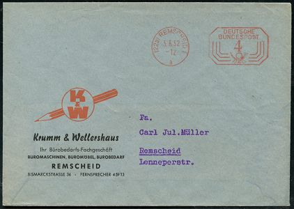 10368 | 14 € | 5630 REMSCHEID : (22a) REMSCHEID 1/ a/ DEUTSCHE/ BUNDESPOST 1952 (3.6.) PFS Achteck "Posthorn" 4 (Pf.) auf zweifarbiger Reklame-Bf.: Krumm & Wellershaus Büro-Fachgeschäft.. (Bleistift), Orts-Drs.-Bf. | ![]() | |