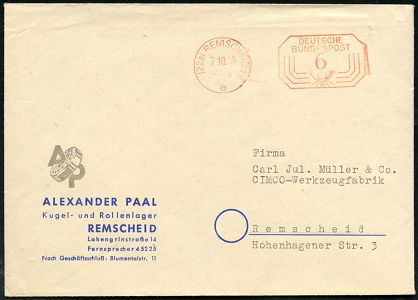 10372 | 10 € | 5630 REMSCHEID : (22a) REMSCHEID 1/ a/ DEUTSCHE/ BUNDESPOST 1953 (7.10.) PFS "Achteck Posthorn" 4 (Pf.) auf zweifarbigem Firmen-Reklame-Bf.: ALEXANDER PAAL, Kugel- u. Rollenlager.. mit Rollenlager (Dp.D-16, Nr.272 `= Posthorn mit 4 Blitzen) | ![]() | |