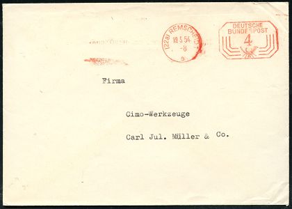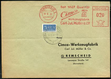 10364 | 18 € | 5630 REMSCHEID : REMSCHEID 1/ ..Cimco/ WERKZEUGFABRIK/ Carl Jul.Müller & Co 1951 (11.9.) AFS Francotyp "Posthorn" 20 (Pf.) mit Firmenlogo: Telefonapparat auf vorausfrankiertem Antwort-Bf. (daher Mittelfalte) am Aufgabeort vorschriftsmäßig mit 2 Pf. NoB nachfrankiert, 2K-Steg: (22 a) WERMELSKIRCHEN/f (Dü.E-23CG) | ![]() | |