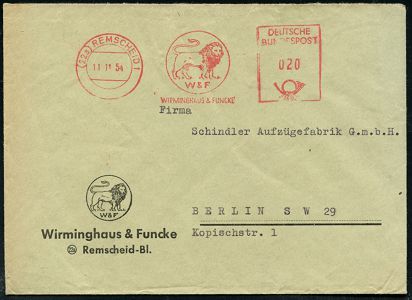 10375 | 18 € | 5630 REMSCHEID : (22a) REMSCHEID 1/ W&F/ WIRMINGHAUS & FUNCKE 1954 (11.11.) AFS Postalia mit Firmenlogo = Löwe, motivgl. Firmen-Fern-Bf. n. West-Berlin + Postalia-Faksimile, (Dü.E-23 B) | ![]() ![]() | |