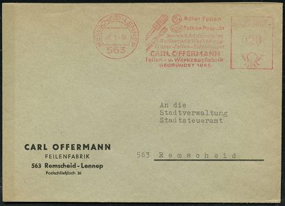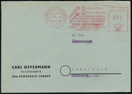 10382 | 15 € | 5630 REMSCHEID : REMSCHEID-LENNEP/ Adler-Feilen/ Falken-Raspeln/ ..Rotierende Werkzeuge../ CARL OFFERMANN.. 1959 (25.11.) AFS Francotyp (Motive: 2 Rotations-Feilen) Orts-Firmen-Bf., seltene Motive! (Dü.E-23CO) | ![]() | |