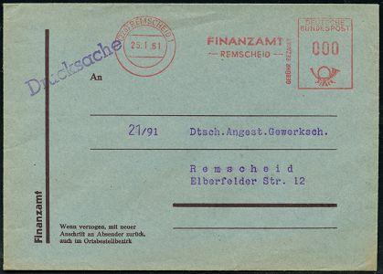 10386 | 10 € | 5630 REMSCHEID : (22a) REMSCHEID 1/ FINANZAMT../ GEBÜHR BEZAHLT 1961 (25.1.) AFS Francotyp in 000 + Gebühr bezahlt = vorschriftsmäßig für Massen-Drs.! (vom 1.7.54 bis 30.9.69) Orts-Dienst-Bf. (Dü.E-23CGo) | ![]() | |