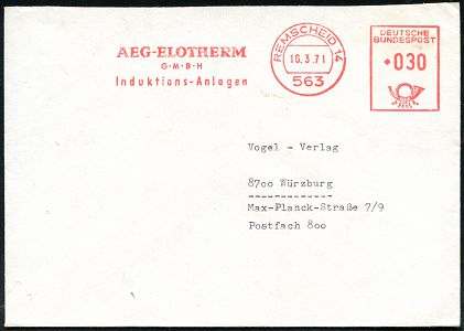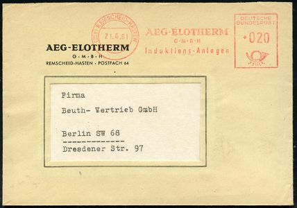 10387 | 20 € | 5630 REMSCHEID : (22a) #bzw.# 563 REMSCHEID-HASTEN #bzw.# REMSCHEID 14/ AEG-ELOTHERM../ Induktions-Anlagen 1961/71 2 verschiedene AFS Francotyp , je auf AEG-Firmen-Bf., 2 Belege (Dü.E-23CO, E-26) | ![]() ![]() | |
