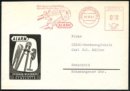 10388 | 16 € | 5630 REMSCHEID : (22a REMSCHEID 1/ Mit neuem, stufenlosem/ Schnell-Nachsteller/ ALARM 1961 (10.10.) AFS Francotyp = Spezial-Zange klar auf motiv-ähnl. Reklame-Bf.: ALARM, HERMANN WEGERHOFF, Alarm-Werkzeugfabrik (Dü.E-26, alte PLZ) | ![]() | |