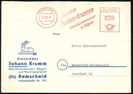 10389 | 15 € | 5630 REMSCHEID : REMSCHEID 1/ Seit 1794/ Johann Krumm/ Maschinenmesser/ u.Sägen 1961 (31.10.) AFS Francotyp ohne PLZ auf Firmen-Bf.: Electrodur, Johann Krumm.. mit Firmen-Logo (Hirsch), Orts-Bf. (Dü.E-23CGo) | ![]() | |