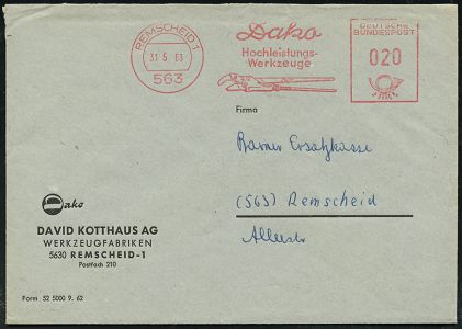 10393 | 14 € | 5630 REMSCHEID : 563 REMSCHEID 1/ Dako/ Hochleistungs-/ Werkzeuge 1963 (31.5.) AFS Francotyp (Motov: Rohrzange) Firmen-Bf.: DAVID KOTTHAUS AG.. (Dü.E-23CO) | ![]() | |