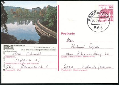 10403 | 14 € | 5630 REMSCHEID : 563 REMSCHEID 1/ aa 1986 (25.7.) 1K-Segment auf ortsgleicher BiP 60 Pf. Burgen: REMSCHEID,, Eschbachtalsperre (1891), Erste Trinkwassertalsperre Deutschlands (Talsprrenkrone) Fern-Kt., seltene Kombination (Mi.P 138/p 14-214) | ![]() | |