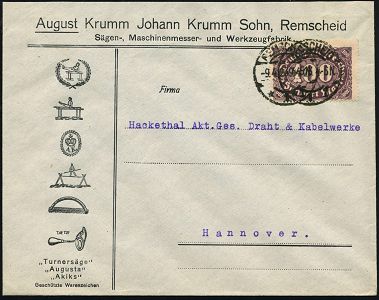 10308 | 25 € | 5630 REMSCHEID : REMSCHEID/ *1f 1922 (9.4.) 1K-Brücke auf Reklame-Bf.: Agust Krumm.. Werkzeugfabrik , schöne Motive mit 2x Barrenturngerät, Hochseil m. Drahtseilakt, Handsäge etc., dekorativer Infla-Fern-Bf. (Mi.247 EF) | ![]() | |