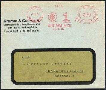 10312 | 25 € | 5630 REMSCHEID : REMSCHEID-/ VIERINGHAUSEN/ ..BRIEFTRÄGER/ ..KRUMM & Co./ m.b.H. 1931 (17.12.) AFS Francotyp "Bogenrechteck" (Monogr./ Briefträger m.Brief) klar gest. Firmen-Bf.: Krumm & Co..Gesenkschmiede u. Dampfhammerwerk (Dü.E-1CEh) | ![]() | |