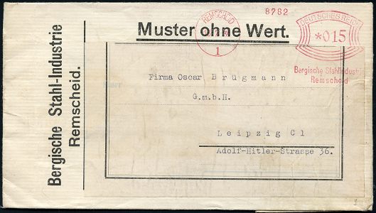 10317 | 30 € | 5630 REMSCHEID : REMSCHEID/ 1/ Bergische Stahlindustrie.. 1934 (13.7.) AFS Francotyp "Bogenrechteck" 015 Pf. auf Firmen-Musterbeutel "Muster ohne Wert" , seltene Portostufe u. Verwendung!, seltee Portostufe u. Verwendung! (Dü.E-1Ah) | ![]() | |