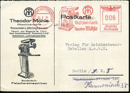 10339 | 28 € | 5630 REMSCHEID : REMSCHEID-LÜTTRINGHAUSEN/ TM/ Fleischerei-/ Maschinen-Fabrik/ Theodor Möhle 1939 (31.8.) AFS Francotyp "Reichsadler" (Motiv: elekr. Fleischerei-Fleischwolf) motivgl. Reklame-Kt.!, sehr dekorativ, seltenes Motiv! (Dü.E-5CGo) | ![]() | |