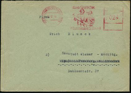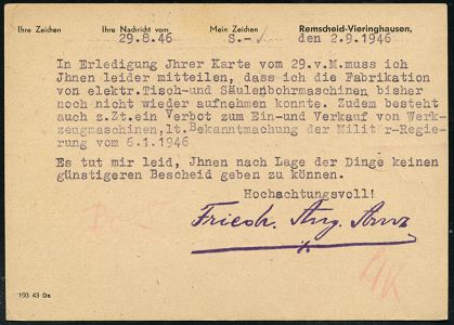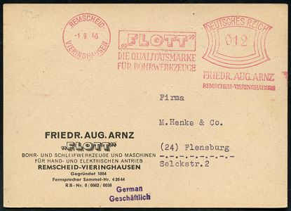 10347 | 30 € | 5630 REMSCHEID : REMSCHEID-/ VIERINGHAUSEN/ "FLOTT"/ DIE QUALITÄTSMARKE/ FÜR BOHRWERKZEUGE/ FRIEDR.AUG.ARNZ.. 1946 (1.9.) AFS Francotyp Bogenrechteck "DETSCHES REICH" u n v e r ä n d e r t weiterverwendet = Notmaßnahme ! , Firmen-Kt., rs. interess. Text über Verbot der alliierten Militär-Regierung zur Produktion von Werkzeugmaschinen, seltener Beleg zur Zeitgeschichte! (Dü.E-1CEo, unverändert) | ![]() ![]() | |