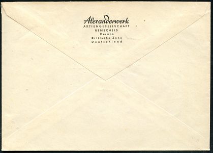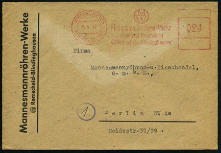 10349 | 20 € | 5630 REMSCHEID : REMSCHEID-/ BLIEDINGHAUSEN/ MW/ Mannesmann-Werke.. 1947 (25.4.) seltener, aptierter AFS "Hakenkreuz" = entfernt + Inschrift "Deutsches Reich" = Notmaßnahme! , Firmen-Bf. (mittig etw. ausgeblichen) n. Ost-Berlin (Dü.E-12 AK-98o) | ![]() | |