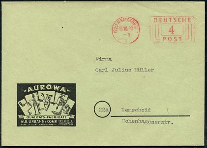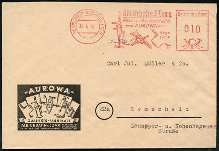 10358 | 15 € | 5630 REMSCHEID : (22a) REMSCHEID 1/ a/ DEUTSCHE/ POST 1950 (13.10.) PFS Querrechteck 4 (Pf.) auf Reklame-Bf.: "AUROWA".. ALB URBAHN COMP., WERKZEUG- U. MASCHINENFABRIK mit 5 Produkten u.a. Bohrmaschinen, Fleischwolf etc. Orts-Drs.-Bf. (Dü.D-10, Nr.253) | ![]() | |