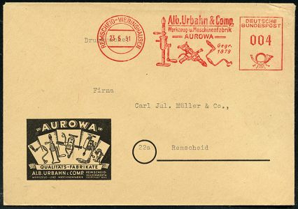 10356 | 18 € | 5630 REMSCHEID : REMSCHEID-VIERINGHAUSEN/ Alb.Urbahn & Comp./ Werkzeug-u.Maschinenfabrik/ AUROWA/ Gegr.1879 1951 (23.5.) AFS Francotyp "Posthorn" mit Inschrift "DEUTSCHE BUNDESPOST" (Motive: 2 Hand-, 1 Elektro-Bohrmaschine, 1 Fleischwolf), dekorativer. motivgl. Reklame-Bf., vergl. Kat.-Nr.10353, 10355, 10358 (Dü.E-23CGo = Erstjahr !) | ![]() | |