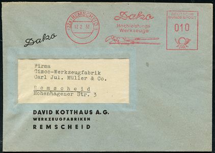 10367 | 15 € | 5630 REMSCHEID : (22a) REMSCHEID 1/ Dako/ Hochleistungs/ Werkzeuge 1952 (12.2.) AFS Francotyp (Motiv: Rohrzange) Firmen-Orts-Bf. (Dü.E-23CO) | ![]() | |