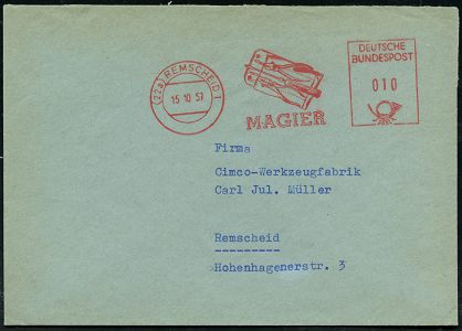 10378 | 15 € | 5630 REMSCHEID : (22a) REMSCHEID 1/ MAGIER 1957 (15.10.) AFS Postalia (Motiv: Werkzeug-Set: 2 Zangen, 1 Schraubenzieher) rs. Abs.-Vordruck: MAGIER-WERKZEUGKOMPANIE, M. Gies & Co., Orts-Bf. (Dü.E-23 B) | ![]() ![]() | |