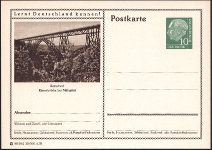 10379 | 8 € | 5630 REMSCHEID : Remscheid 1958 10 Pf. BiP Heuss I, grün: Riesenbrücke bei Müngsten (= Eisenbahn-Viadukt) ungebr. (Mi.P 24/370) | ![]() | |