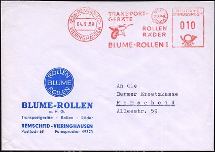 10381 | 16 € | 5630 REMSCHEID : (22a) REMSCHEID-/ VIERINGHAUSEN/ TRANSPORT-/ GERÄTE/ ../ RÄDER/ BLUME-ROLLEN 1959 (4.9.) AFS Francotyp (Motiv: Schubkarre) Orts-Firmen-Bf.: BLUME-ROLLEN O:H.G., Transportgeräte, Rollen, Räder.. (Dü.E-23CO) | ![]() | |