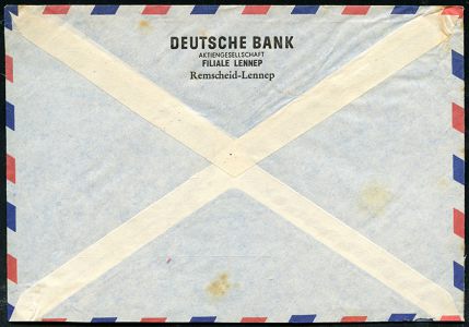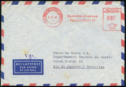 10384 | 16 € | 5630 REMSCHEID : (22a) REMSCHEID-LENNEP/ ..Postschließfach 82 1960 (1.8.) anonymer AFS Francotyp 080 Pf. = Deutsche Bank , rs. Abs.-Vordruck: DEUTSCHE BANK.. FILIALE LENNEP (schwache Fleckchen), Übersee-Flp.-Bf. n. Rio de Janeiro (Dü.E-23CG) | ![]() ![]() | |