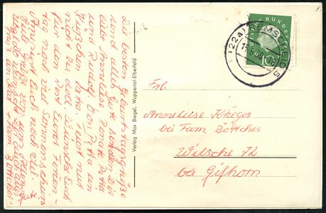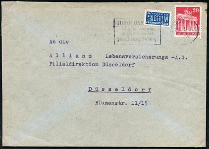 10360 | 16 € | 5630 REMSCHEID : (22a) REMSCHEID 1/ a/ RUNDFUNK HÖREN/ ist sehr wichtig/ doch - es ist/ gebührenpflichtig! 1951 (5.1.) Serien-MaWSt auf EF 20 Pf. Bauten + 2 Pf. NoB , rs. Abs.-Vordruck: Else Lex.., Fern-Bf. (Bo.S 484 A, nur 1951-53 verwendet) | ![]() | |