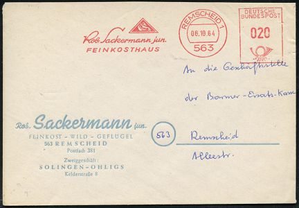 10396 | 14 € | 5630 REMSCHEID : 563 REMSCHEID 1/ Rob.Sackermann jun./ FEINKOSTHAUS 1974 (6.10.) AFS Francotyp = Hummer (= Firmenlogo) Firmen-Bf.: Rob. Sackermann jr., FEINKOST - WILD -GEFLÜGEL.., seltenes Motiv! (Dü.E-26) | ![]() | |