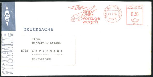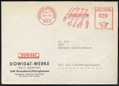 10398 | 15 € | 5630 REMSCHEID : 563 REMSCHEID-LÜTTRINGHAUSEN/ DOWIDAT/ QUALITÄTS-WERKZEUGE 1965 (30.6.) AFS Francotyp (Motive: 3 Schraubschlüssel, Zange, Bolzen) rs. Abs.-Vordruck, klar gest., zweifarbiger Orts-Bf., schöne und seltene Motive! (Dü.E-23CG) | ![]() | |