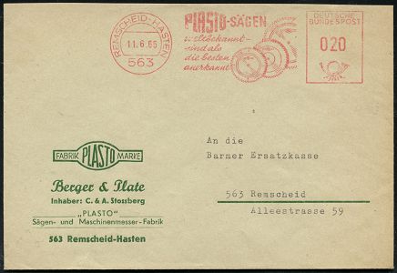 10399 | 14 € | 5630 REMSCHEID : 563 REMSCHEID-HASTEN/ PLASTO-SÄGEN/ weltbekannt.. 1965 (11.6.) AFS Francotyp (Motiv: 3 Sägeblätter) Firmen-Bf.: FABRIK PLASTO MARKE, Berger & Plate.. (Firmen-Logo), Orts-Bf. (Dü.E-23CO) | ![]() | |