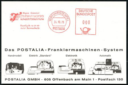 10402 | 18 € | 5630 REMSCHEID : 5630 Remscheid 1979 (24.10.) AFS: VORFÜHRSTEMPEL/POSTALIA/Hans Günter/FUHRMANN/KONZERTDIREKTION (Initiale als Harfe), seltene Postalia-Musterkt.! (= Specimen) | ![]() | |
