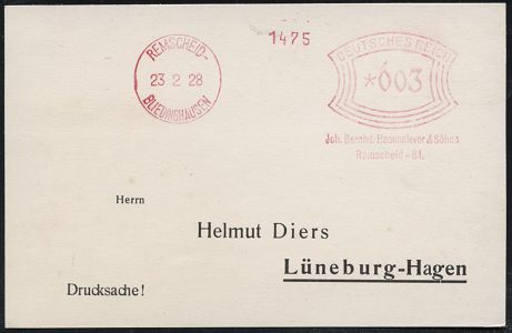 10309 | 20 € | 5630 REMSCHEID : REMSCHEID-/ BLIEDINGHAUSEN/ Joh.Bernhd.Hasenclever & Söhne.. 1928 (23.2.) AFS Francotyp "Bogenrechteck" auf Inl.-Drs.-Karte (Dü.E-1Ah) | ![]() | |