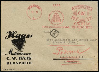 10311 | 25 € | 5630 REMSCHEID : REMSCHEID/ 1/ Sägen-u.Maschinenmesserfabrik/ C.W.HAAS 1931 (9.1.) AFS Francotyp "Bogenrechteck" 025 Pf. (Sägeblatt, Maschinenmesser) klar auf Reklame-Bf.: Haas-Mähmesser.. (links gr. Riß geschl.) an die "Welt-Aukunftei Pössneck" in Budapest (rs. 2 Ank.Stpl. BUDAPEST 741) nach Pössneck zurück geleitet! (Dü.E-1CEh) | ![]() ![]() | |