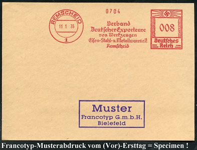 10320 | 35 € | 5630 REMSCHEID : REMSCHEIDE/ 1/ Verband/ Deutscher Exporteure/ von Werkzeugen/ Eisen-Stahl-u.Metallwaren e.V.. 1935 (11.1.) AFS-Musterabdruck Francotyp "Hakenkreuz" , glasklar gest. Francotyp-Musterblatt vom (Vor)-Ersttag !, selten! (Dü.E-3CEh) | ![]() ![]() | |