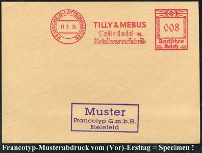 10321 | 35 € | 5630 REMSCHEID : REMSCHEID-LÜTTRINGHAUSEN/ TILLY & MEBUS/ Celluloid-u./ Metallwarenfabrik 1935 (11.3.) AFS-Musterabdruck Francotyp "Hakenkreuz" , glasklar gest. Francotyp-Musterblatt vom (Vor)-Ersttag !, selten! (Dü.E-3CEo) | ![]() ![]() | |