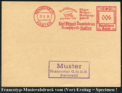 10322 | 35 € | 5630 REMSCHEID : REMSCHEID-/ HASTEN/ ..Sägen-/ Messe-/ Werkzeug-/ Fabrik/ Carl Eduard Dominicus.. 1935 (27.5.) AFS-Musterabdruck Francotyp "Hakenkreuz" (Firmenlogo: Schirmmütze) glasklar gest. Francotyp-Musterblatt vom (Vor)-Ersttag !, selten! (Dü.E-3CEo) | ![]() ![]() | |