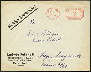 10327 | 10 € | 5630 REMSCHEID : REMSCHEID/ * 2 IV/ DEUTSCHES REICH 1937 (27.1.) PFS "Achteck" 3 (Pf.) auf Firmen-Bf.: Lufwig Feldhoff, ELEKTROTECHN. FABRIK, Spez. Elektro-Heizkörper (Dü.D-4) | ![]() | |
