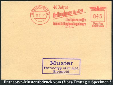 10328 | 35 € | 5630 REMSCHEID : REMSCHEID 2/ 40 Jahre/ Ortlinghaus Qualität/ Maschinenmesse/ Original Ortlinghaus Kupplungen/ D.R.P. 1937 (22.2.) AFS-Musterabdruck Francotyp "Reichsadler" , glasklar gest. Francotyp-Musterblatt vom (Vor)-Ersttag !, selten! (Dü.E-5CGo) | ![]() ![]() | |