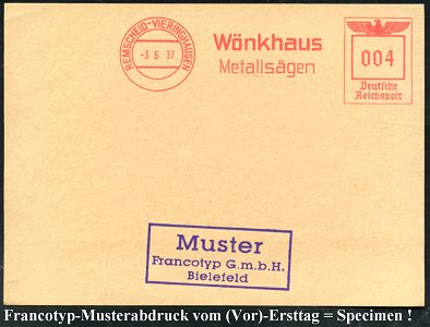 10329 | 35 € | 5630 REMSCHEID : REMSCHEID-VIERINGHAUSEN/ Wönkhaus/ Metallsägen 1937 (3.5.) AFS-Musterabdruck Francotyp "Reichsadler" , glasklar gest. Francotyp-Musterblatt vom (Vor)-Ersttag !, selten! (Dü.E-5CGo) | ![]() ![]() | |