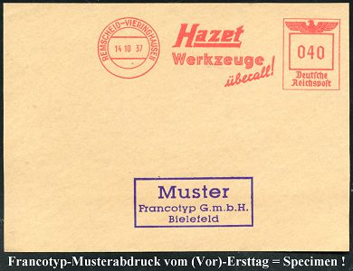 10330 | 35 € | 5630 REMSCHEID : REMSCHEID-VIERINGHAUSEN/ Hazet/ Werkzeuge/ überall! 1937 (14.10.) AFS-Musterabdruck Francotyp "Reichsadler" , glasklar gest. Francotyp-Musterblatt vom (Vor)-Ersttag !, selten! (Dü.E-5CGo) | ![]() ![]() | |