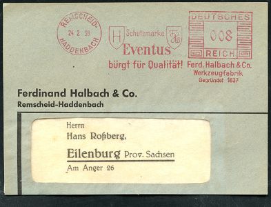 10331 | 14 € | 5630 REMSCHEID : REMSCHEID-/ HADDENBACH/ Schutzmarke/ Eventus../ Ferd.Halbach & Co./ Werkzeugfabrik.. 1938 (24.2.) AFS Francotyp "Mäanderrechteck" (2 Monogr.-Wappen) Firmen-Vorderseite (Dü.E-2CEo) | ![]() | |