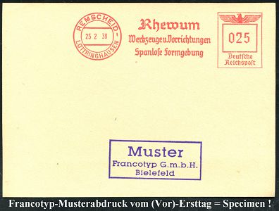10332 | 35 € | 5630 REMSCHEID : REMSCHEID-/ LÜTTRINGHAUSEN/ RHEWUM/ Werkzeuge u.Vorrichtungen/ Spanlose Formgebung 1938 (25.2.) AFS-Musterabdruck Francotyp "Reichsadler" , glasklar gest. Francotyp-Musterblatt vom (Vor)-Ersttag !, selten! (Dü.E-5CGo) | ![]() ![]() | |