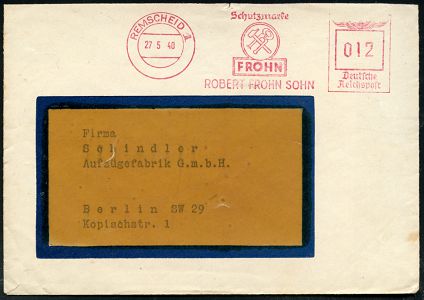 10340 | 18 € | 5630 REMSCHEID : REMSCHEID 1/ Schutzmarke/ FROHN/ ROBERT FROHN SOHN 1940 (27.5.) AFS Francotyp "Reichsadler" (Logo mit Hammer u. Kneifzange) Fern-Bf., vergl. Kat.-Nr.10 316 (Dü.E-5CGo) | ![]() | |