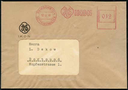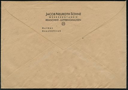 10341 | 35 € | 5630 REMSCHEID : REMSCHEID-/ LÜTTRINGHAUSEN/ J N S/ IKON 1945 (12.11.) doppelt aptierter AFS Francotyp "Hakenkreuz" = entfernt + Inschrift: "Deutsches Reich" = Notmaßnahme! (Monogr.-Logo) im Klischee ist auch der Abs. entfernt! (vergl. mit Kat.-Nr. 10319), rs. Abs.-Vordruck: JACOB NEUROTH SÖHNE, WERKZEUGFABRIK.. (Dü.E-13 AA-98o = seltene Type!) | ![]() ![]() | |