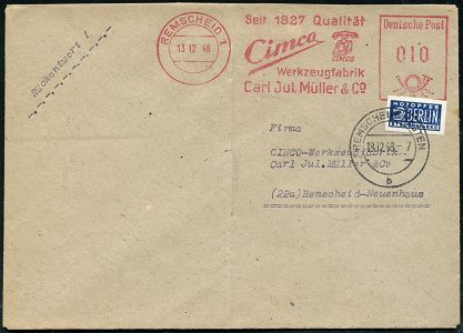 10348 | 18 € | 5630 REMSCHEID : REMSCHEID 1/ Seit 1827 Qualität/ Cimco/ Werkzeugfabrik/ Carl Jul.Müller & Co. 1948 (13.12.) AFS Francotyp Hochrechteck "Posthorn" (Motiv: Telefonapparat) + 2K-Steg: REMSCHEID-HASTEN/b auf ungez. 2 Pf. NoB = vorazsfrankierter Firmen-Antwort-Bf. (daher gefaltet) rs. Abs.-Vordruck (Dü.E-20CGo) | ![]() | |