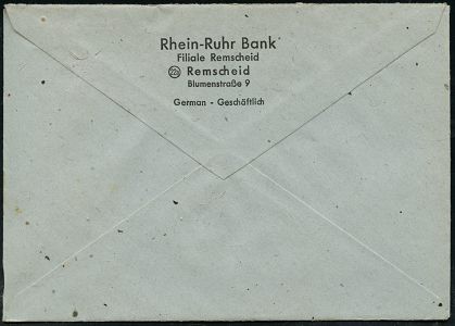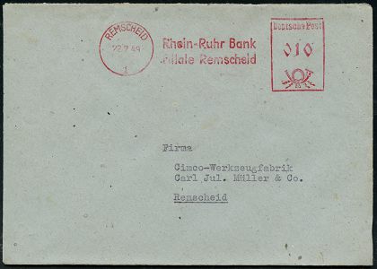 10350 | 16 € | 5630 REMSCHEID : REMSCHEID/ 1/ Rhein-Ruhr-Bank.. 1949 (22.2.) AFS Francotyp "Posthorn" 010 (Pf.) rs. Abs.-Vordruck, Orts-Bf. (Dü.E-20BAo) | ![]() ![]() | |