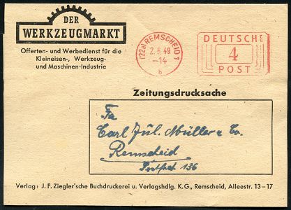 10352 | 18 € | 5630 REMSCHEID : (22a) REMSCHEID 1/ b/ DEUTSCHE/ POST 1949 (2.6.) PFS Querrechteck 4 (Pf.) auf kleinem Zeitungsstreifband: DER WERKZEUGMARKT.. mit Zahnrad-Logo (Dü.D-10, Nr.253) | ![]() | |